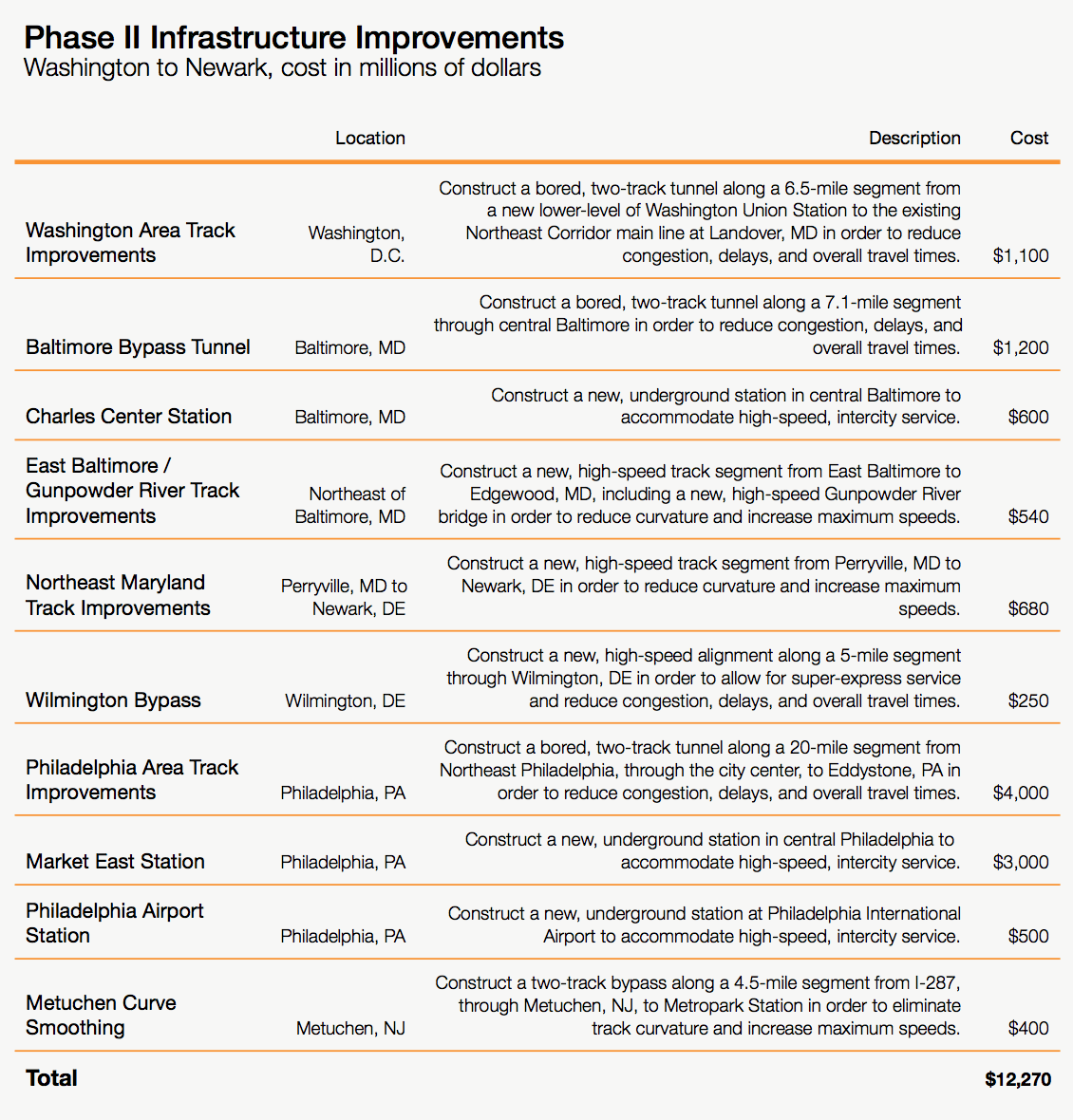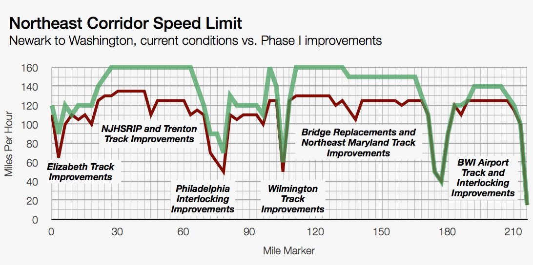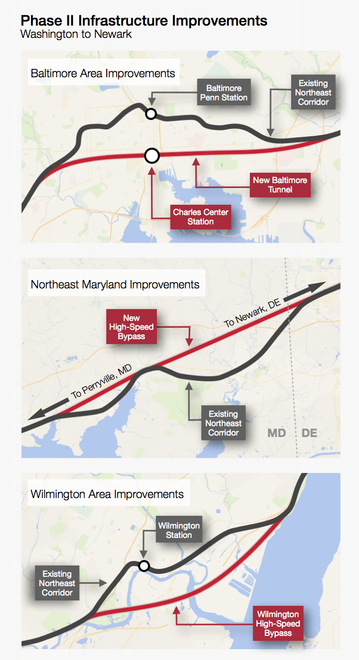 Overall, Phase II improvements to the southern section of the Northeast Corridor would allow for dramatic increases in speed as well as reduced congestion in some of the Northeast Corridor’s longest-standing bottlenecks. These improvements will complete a fully-separated express lane throughout the entirety of the southern section of the Northeast Corridor allowing high-speed trains to bypass traditional choke points caused by freight and commuter railroads. In comparison to Phase I, Phase II improvements would increase maximum speeds throughout the corridor to 220 miles-per-hour, thus reducing travel time from Washington to Newark to approximately 85 minutes.