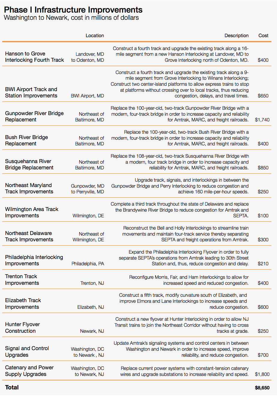Phase I improvements along the remainder of the southern section of the Northeast Corridor will mirror the sorts of improvements being implemented by the NJHSRIP. Constructing constant-tension catenary wire, improving signaling systems, and modifying curves across other key segments of track will help to increase current maximum speeds throughout the entire southern section of the Northeast Corridor. In addition, the replacement and rearrangement of a number of key interlockings throughout the southern section of the Northeast Corridor would improve travel times through congested bottlenecks in southern New Jersey, eastern Pennsylvania, and Delaware. Even using current train sets and the Northeast Corridor’s existing right-of-way, an initial phase of improvements can go a long way towards increasing maximum train speeds to 160 miles per hour across a large portion of trackage in between Washington and Newark.
