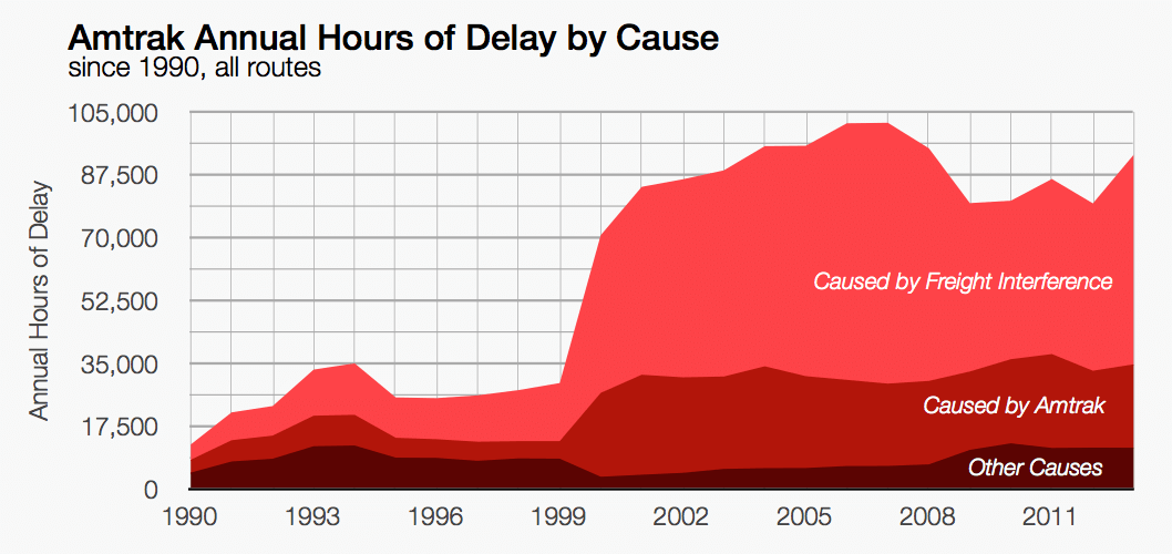 Achieving even faster speeds along the southern portion of the Northeast Corridor will require significant infrastructural improvements in order to completely separate high-speed trains from slower commuter and freight trains, which have caused increasing congestion and delays over the past several decades. Among the 1.2 million people in the Northeast Corridor region who get to work by commuter rail, 62% of passengers and 53% of trains travel along at least some portion of the Northeast Corridor. Further, freight interference has increased nearly ten-fold over the past 20 years.
