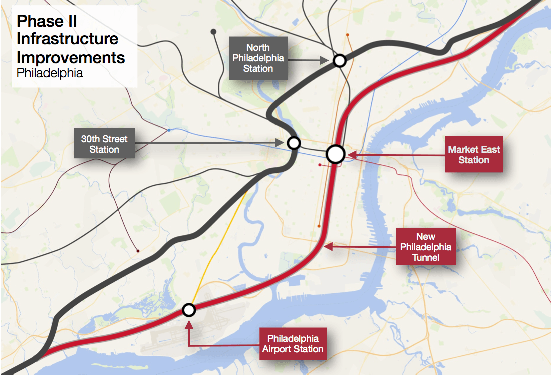 For trains approaching Philadelphia from the south, the four main line tracks of the Northeast Corridor are joined by two SEPTA tracks at Phil Interlocking. Of these six tracks, one track ends, one track branches off to the South Philadelphia Freight Yard, and two tracks join another SEPTA line that travels through the upper level of 30th Street Station, thus leaving just two Northeast Corridor tracks to terminate in Philadelphia. Leaving Philadelphia towards New Jersey, the two Northeast Corridor tracks are once again joined by two SEPTA tracks. North of the city, another SEPTA line diverges from the Northeast Corridor at Lehigh Interlocking just below the North Philadelphia Station. These divergences and convergences of track occur over the course of numerous tight curves through densely populated areas. Accordingly, achieving faster speeds through Philadelphia requires the complete bypass of the existing Northeast Corridor and 30th Street Station. Phase II improvements to the southern section of the Northeast Corridor would involve the construction of a 20-mile bypass tunnel from the Tacony area of Northeast Philadelphia through the city center and Philadelphia Airport before rejoining the existing Northeast Corridor by Eddystone, PA. A new station would be constructed perpendicular to the current Market East Station. By relocating Philadelphia’s Northeast Corridor station to the urban core, travelers will have intermodal access to not only the central business district, but also a direct link to 15 regional and local rail lines. A new Philadelphia Airport Station would also be constructed to complement the ongoing expansion of the near-capacity airport.