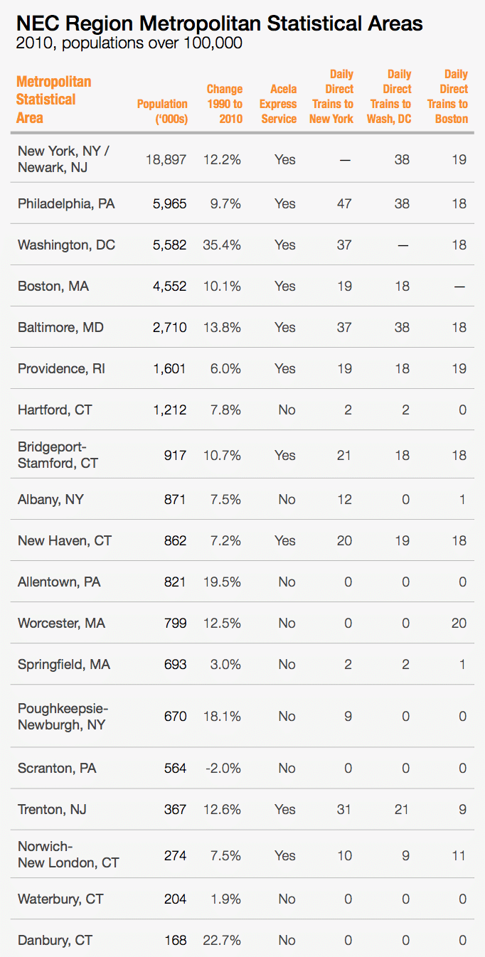 In choosing a new right-of-way for the northern section of the Northeast Corridor, it is important that the new alignment not only reaches underserved markets, but also prepares for additional expansion in the future and creates new demand for each completed segment track. Among the 19 metropolitan statistical areas (“MSAs”) in the Northeast Corridor region with over 100,000 residents, nine MSAs with a combined population of over six million residents do not have any direct access to express intercity rail service. Cities like Hartford and Springfield, which combine for almost two million residents and are only 100 miles from Boston and New York, are still relatively isolated in terms of the availability of intercity rail service. Since 1990, other MSAs like Poughkeepsie-Newburgh and Worcester have grown much faster than MSAs such as Providence and New Haven. Finally, the 100-mile segment of track that runs through eastern Connecticut and Rhode Island serves a relatively isolated population of just 300,000 residents.