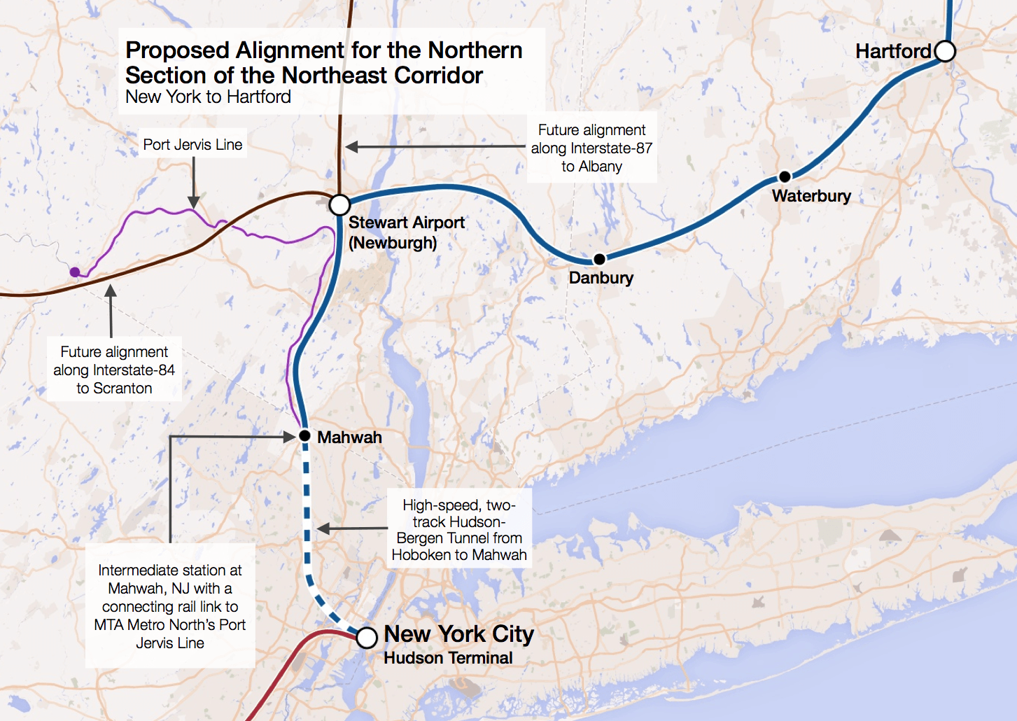 To maximize the benefits of a new northern section of the Northeast Corridor, Real Transit proposes constructing a new alignment through Stewart International Airport in Newburgh, NY. Getting to Stewart Airport from Hoboken Station would require the construction of a 27-mile, high-speed rail tunnel to Mahwah, NJ, where the tracks would then follow the general right-of-way of Interstate-87. At top speeds of 220 miles-per-hour, an express train could travel from Hudson Terminal to Stewart Airport in under 25 minutes. Even at top speeds of just 120 miles-per-hour, an express train could travel from Hudson Terminal to Stewart Airport in under 40 minutes. Continuing from Stewart Airport to Hartford, the proposed alignment would follow Interstate-84 through intermediate stations in Danbury and Waterbury. At roughly the halfway point between New York and Boston, express trains traveling along the proposed alignment from Hudson Terminal to Hartford at top speeds of 220 miles-per-hour would be able to make the trip in just 65 minutes.
