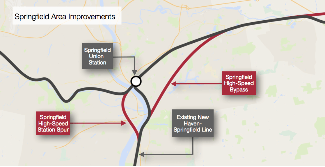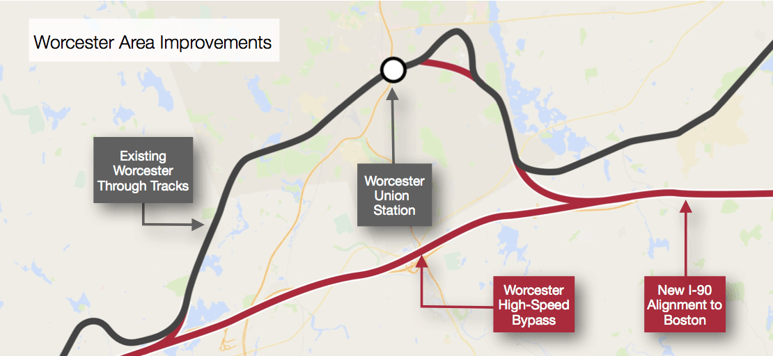 From Hartford, tracks would follow a new alignment along Interstate-91 towards Springfield. At the area around King’s Island, tracks would diverge from the highway and join an upgraded, 10-mile portion of the existing, Amtrak-owned New Haven-Springfield right-of-way. At the southern border of Springfield, the tracks would diverge with one spur looping into the existing Springfield Union Station and another spur bypassing the city towards Interstate-90. A new alignment from Springfield to Worcester would follow Interstate-90 for approximately 40 miles before diverging just east of Auburn, MA, with one spur traveling through Worcester and another bypassing the city center heading towards Boston. The Worcester spur would join existing tracks traveling northeast into the city center and through the existing Worcester Union Station. Exiting the station, tracks would continue along a new, one-mile tunnel to bypass existing curves before rejoining the existing right-of-way at Grafton Hill. The tracks would once again converge at East Milbury, MA to rejoin a 27-mile Interstate-90 alignment to Boston. At the intersection of Interstate-90 and Interstate-95, the alignment would sink to a new 12-mile tunnel before terminating at a new, underground Boston Station. Provisions would be made to allow for a future link to existing routes terminating at Boston’s North Station.