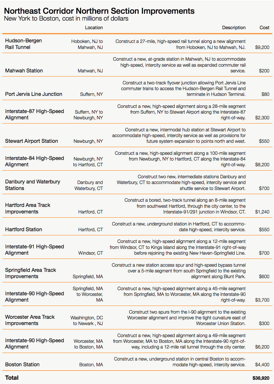 The answer is that intercity rail investments should add value to the regional system as a whole, instead of maintaining a century-old alignment merely because it already exists. Aside from the question of demand, upgrading the existing northern section of the Northeast Corridor would cost significantly more than creating a new alignment due to the tight curves traveling through dense areas that limit average speeds more than on the New York to Washington segment. Amtrak estimates that it’s high-speed upgrades from New York to Boston would cost $58 billion and would not be completed until 2040. It should not cost that much and take so long to bring modern, high-speed service to the northern section of the Northeast Corridor. Thus, moving forward, the most cost-effective way to improve the New York to Boston route is by constructing a completely independent alignment.